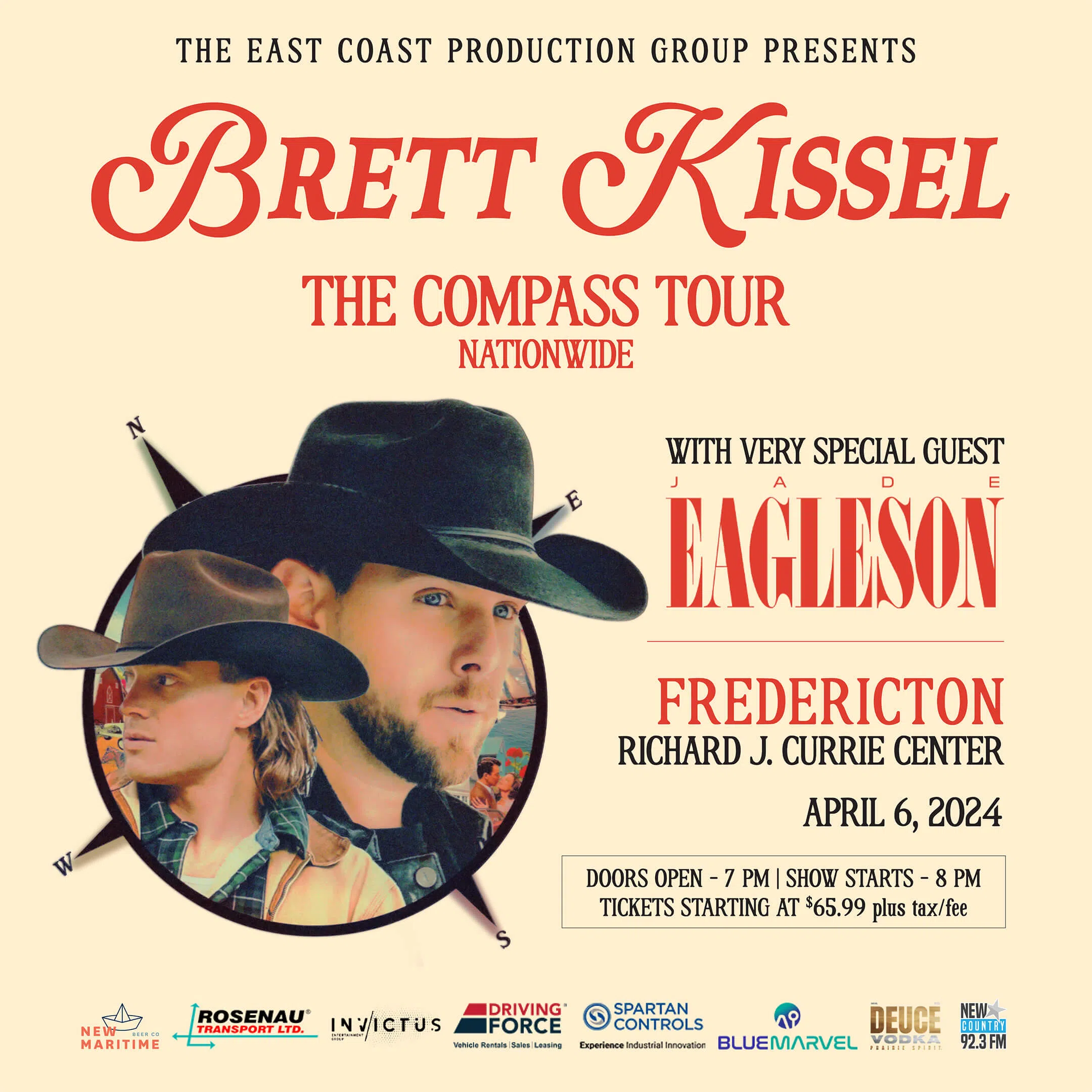 The East Coast Production Group and New Country 92-3 present… Brett Kissel’s The Compass Tour, featuring Jade Eagleson… Live in Fredericton on April 6th at the Richard Currie Centre.